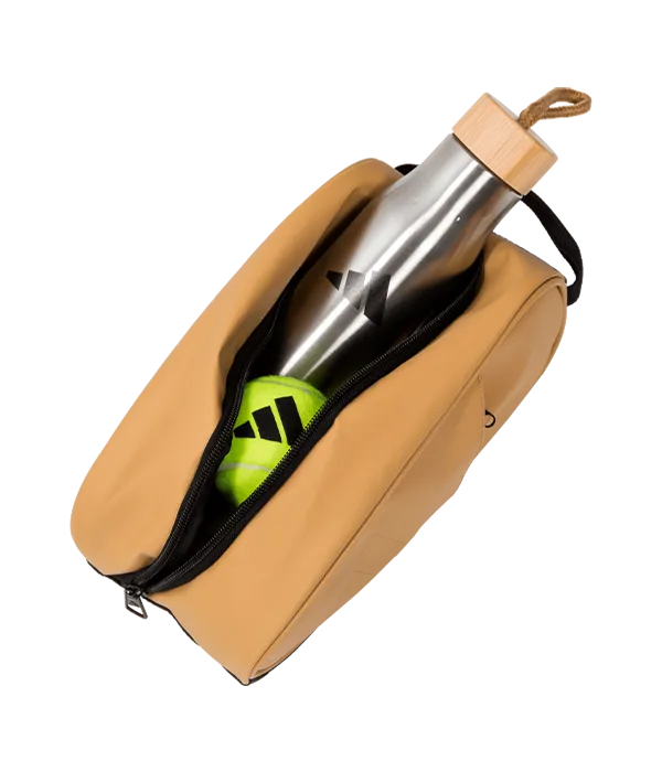 Neceser Adidas color arena con un amplio compartimento central y dos bolsillos laterales con cremallera. Su asa de transporte te permite un agarre cómodo