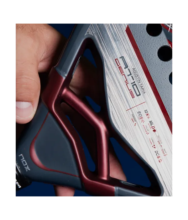 Pack de dos palas NOX AT10 Genius 12K 2025 Agustín Tapia, una pala para jugadores en buscan de un tacto más sólido y rígido. Formato lágrima, este nuevo formato presenta una superficie de carbono 12K y núcleo multicapa MLD Black Eva, que proporciona una sensación de golpeo sólido y de dureza intermedia-alta. En sus caras se ha incluido un rugoso 3D hexagonal en el centro y textura de arena en el resto.