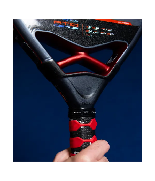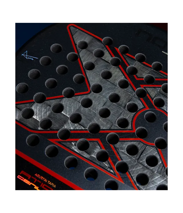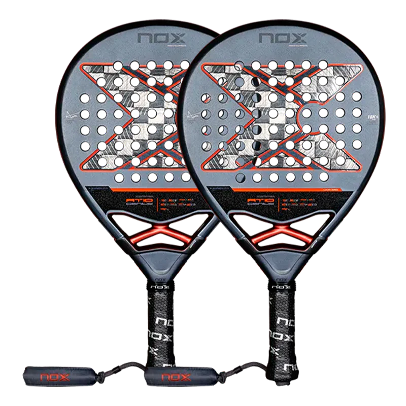 Pack de dos palas NOX AT10 Genius 18K Alum 2025, la pala de Agustín Tapia para la temporada 2025. Una pala fabricada mano a mano junto al Mozart de Catamarca con cara de fibra de carbono aluminizada y un doble acabado rugoso (3D hexagonal en el centro y textura de arena en el resto) mejora el control y permite añadir más efecto a la bola. Esta versión formato lágrima integra en su interior un núcleo multicapa que conjuga distintas densidades de goma para optimizar la salida de bola en golpeos defensivos de baja velocidad y la potencia en remates. También incorpora la tecnología Nox Custom Grip y Pulse Sytem que mejoran la absorción de las vibraciones que llegan a la mano, reduciendo la fatiga articular