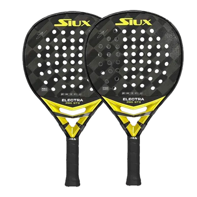Pack de dos palas Siux Electra ST3 Stupa Pro, una pala de alto rendimiento con forma de lagrima. La pala de Franco Stupaczuk integra en su cara Carbono 15K y en su interior una Goma EVA Hard de tacto medio-duro.