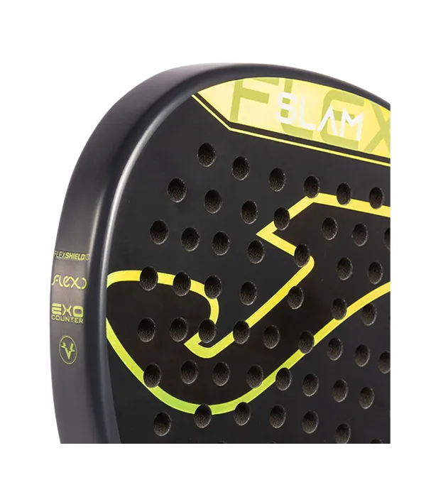 La pala Joma Slam Antracita/Verde, con forma de diamante, combina confort y potencia para mejorar tu juego. Su núcleo FLEXO BlackEVA de alta densidad y fibras FLEXSHIELD de Graphite ofrecen un punto dulce amplio y gran salida de bola, ideal tanto para principiantes como para jugadores con experiencia. El marco EXO COUNTER 100% carbono aporta durabilidad y rigidez, mientras que el sistema VIBRA-OUT Slam reduce un 40% las vibraciones, proporcionando mayor comodidad en cada golpe. Disfruta de una pala cómoda, resistente y fácil de manejar en cada partido.