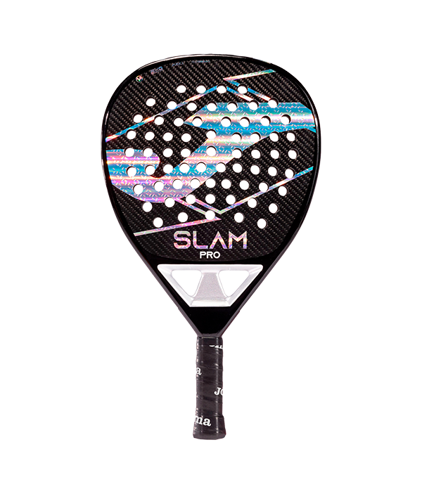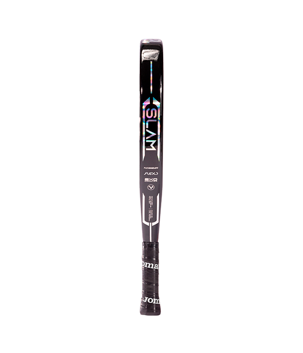 Pala Joma Slam Pro Negro/Plata 2024 destinada a jugadores de nivel avanzado. Su formato diamante equilibra potencia y control. El núcleo está elaborado con FLEXO Black EVA de alta densidad y la superficie integra fibra de carbono FLEXSHIELD 3K. El puente VIBRA-OUT reduce un 40% las vibraciones producidas por el golpeo de la bola.