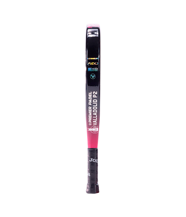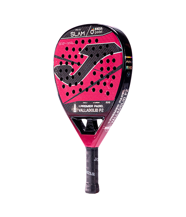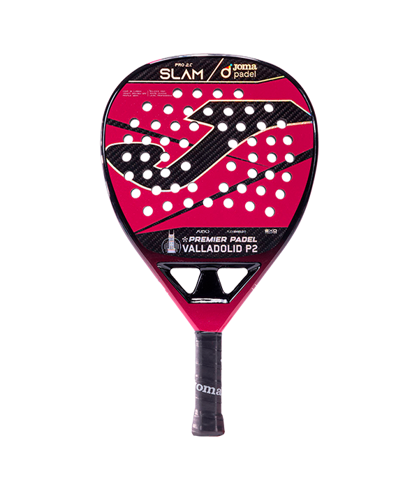 Pala de pádel Slam Pro que se ha personalizado en exclusiva para la Premier Pádel Valladolid P2. Para jugadores profesionales que quieran potenciar su juego. Combina potencia y control con núcleo FLEXO Black EVA y cara de fibra de carbono FLEXSHIELD 3k. Incorpora planos ROTATION y marco de fibra de carbono EXO COUNTER. El puente VIBRA-OUT reduce las vibraciones un 40%, y el mango octogonal asegura comodidad.