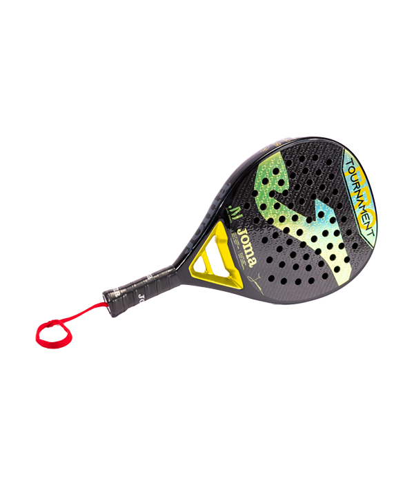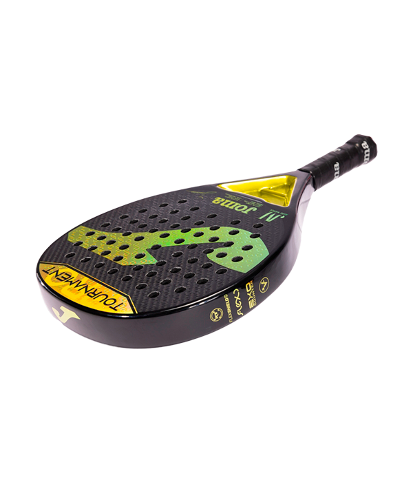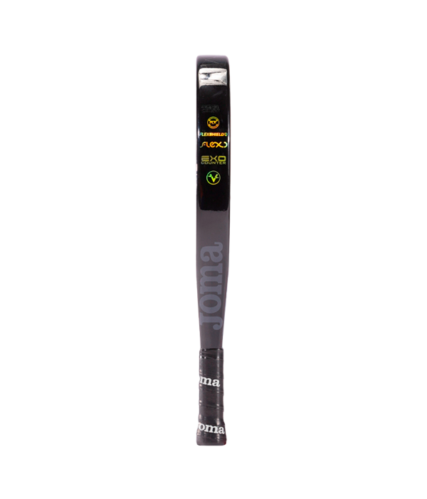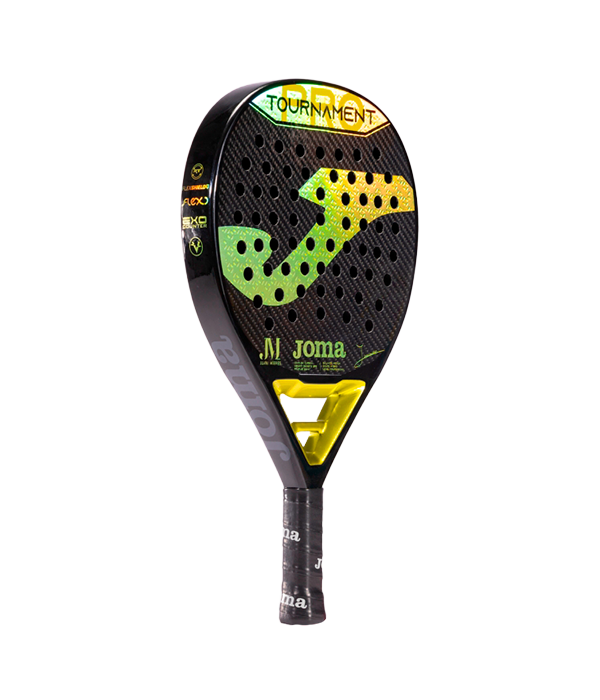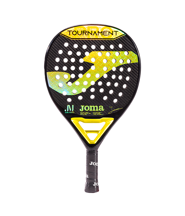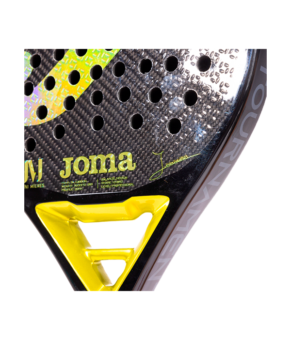 Pala Joma Tournament Pro Negro/Amarillo 2024 con diseño exclusivo para el jugador profesional Juani Mieres. Una pala formato diamante de potencia concebida para jugadores de nivel avanzado. El núcleo FLEXO BlackEVA de alta densidad combinado con la fibra FlexSHIELD 3K garantizan las rigidez y alta potencia.