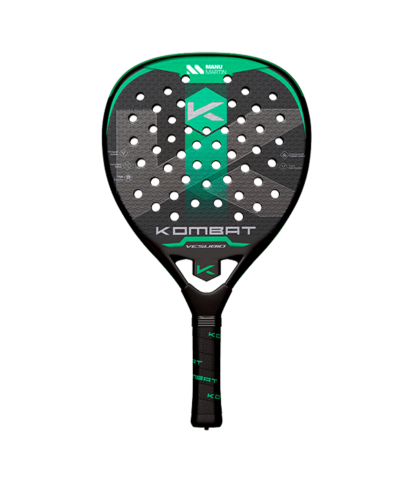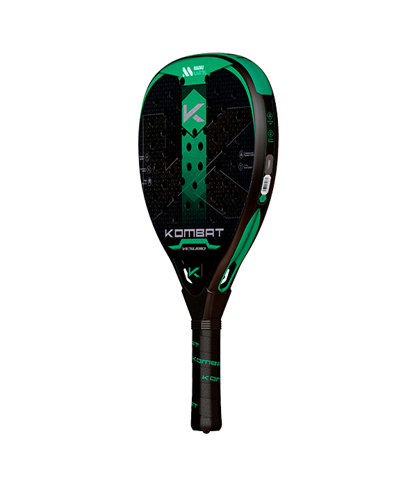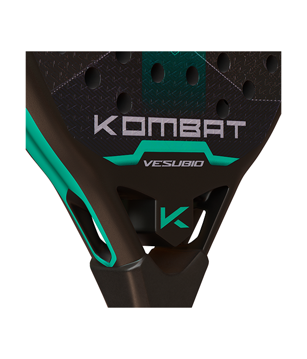 Pala Kombat Vesuvio 2025, una de las palas para jugadores que prefieren un tacto más blando. Esta pala cuenta con un molde en forma de diamante, diseñado para proporcionar un balance alto que favorece la potencia. El tubular de 100% fibra de carbono asegura una estructura ligera y resistente, mientras que los planos de carbono tridimensional (3D) aportan una mayor consistencia y durabilidad