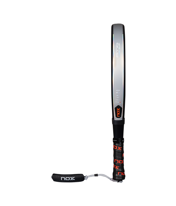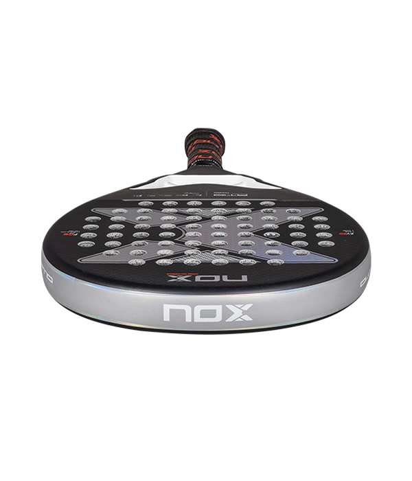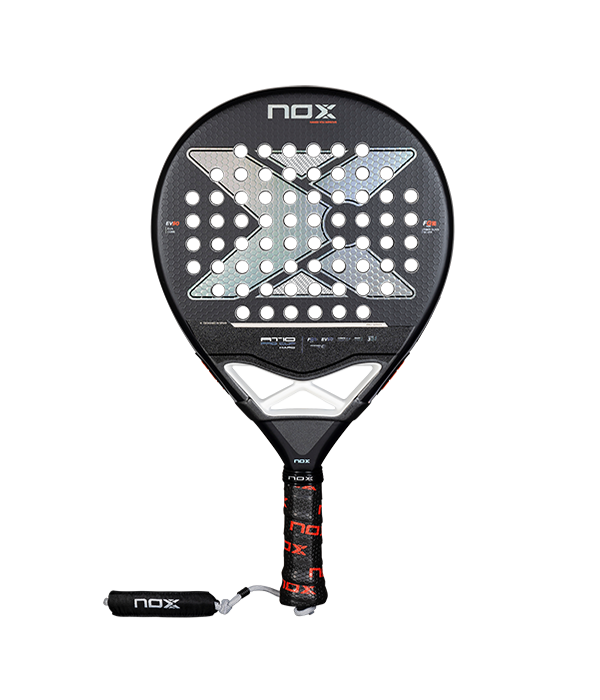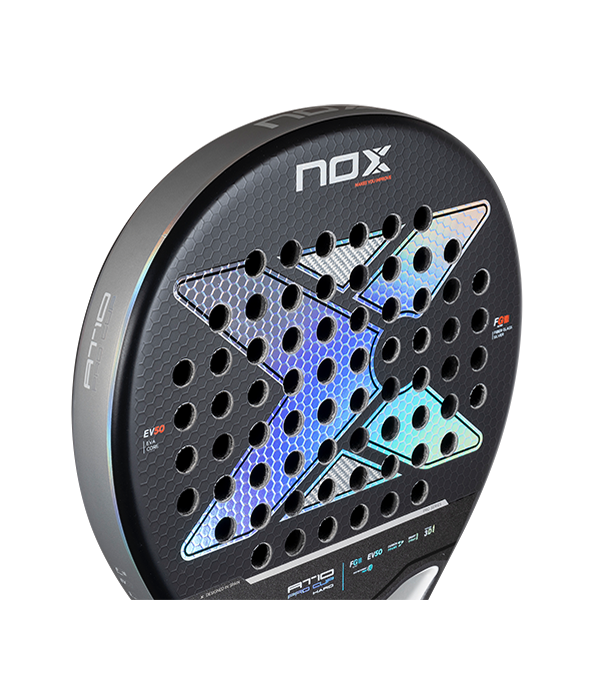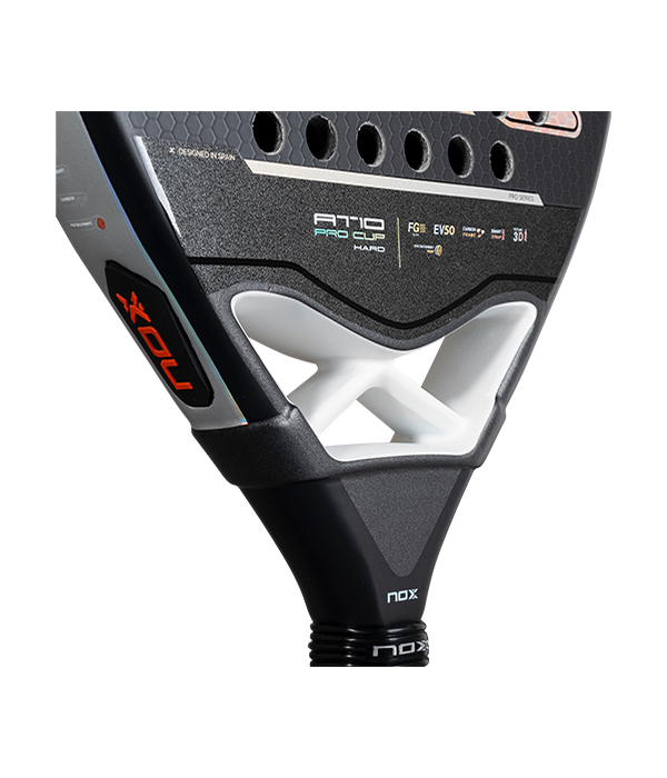 Pala NOX AT10 Pro Cup Hard 2025 Agustín Tapia, fabricada en una combinación de fibra de vidrio con un acabado metalizado y núcleo EV50 ofreciendo una sensación de golpeo con un tacto sólido y dureza intermedia.