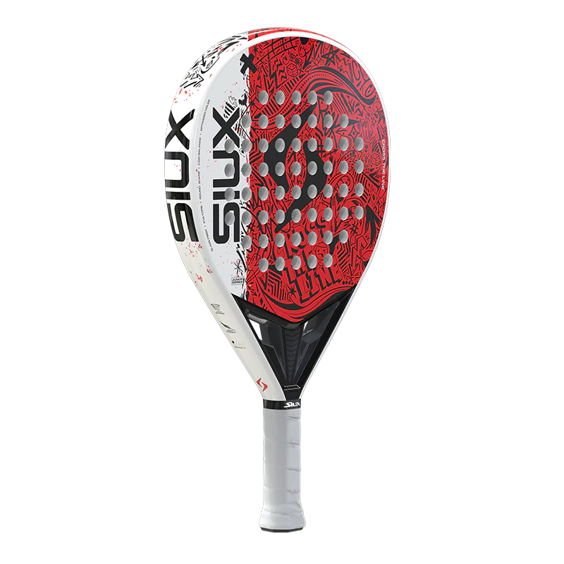 Forma redonda para control. Caras de fibra de vidrio. Núcleo EVA. Peso ligero adaptado a jugadores jóvenes. Balance bajo. Gama Junior.