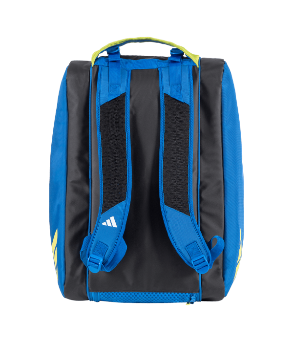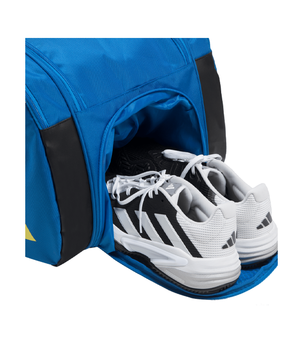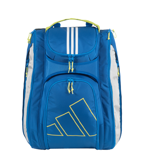 Paletero Adidas Multigame Azul 3.3 2024 con un bolsillo central de amplias dimensiones . En ambos laterales incorpora un bolsillo aislado térmicamente para palas. Debajo del compartimento central hay un espacio con una malla de ventilación diseñada para el calzado. Para objetos pequeños, el bolso tiene tres bolsillos, uno a cada lado y un tercero en la parte superior.
