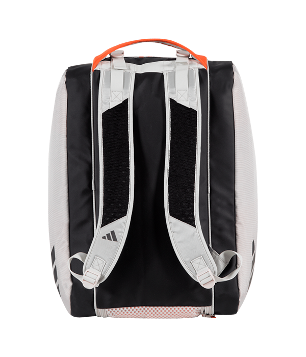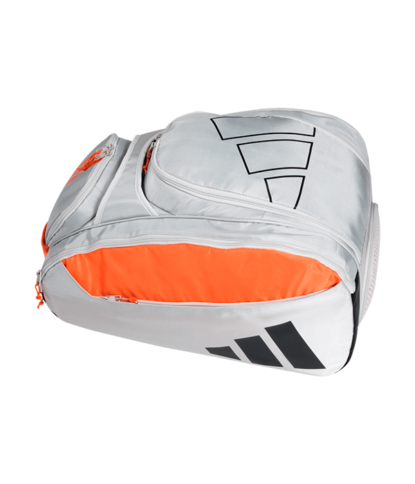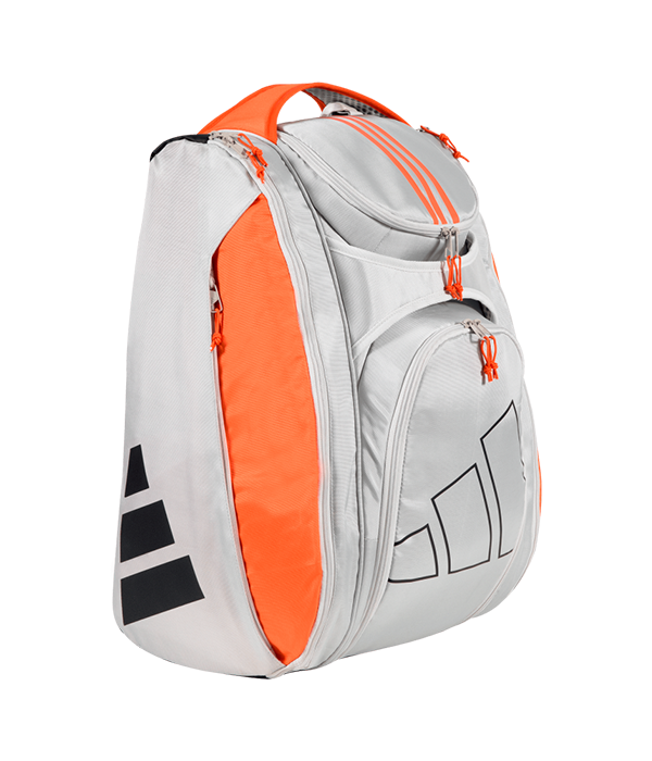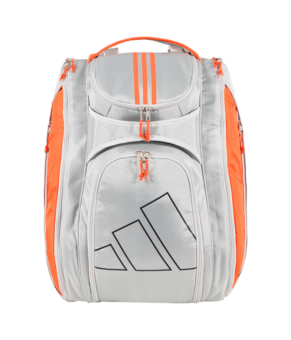 Paletero Adidas Multigame 3.3 blanco y naranja con un bolsillo central de amplias dimensiones para guardar todo el equipamiento. Además integra dos compartimentos laterales específicos recubiertos de aislamiento térmico para almacenar palas. Debajo del compartimento central hay un espacio con rejilla pensado para las zapatillas. Para los objetos pequeños, el paletero cuenta con tres bolsillos, uno a cada lado, y un tercero en la parte superior.