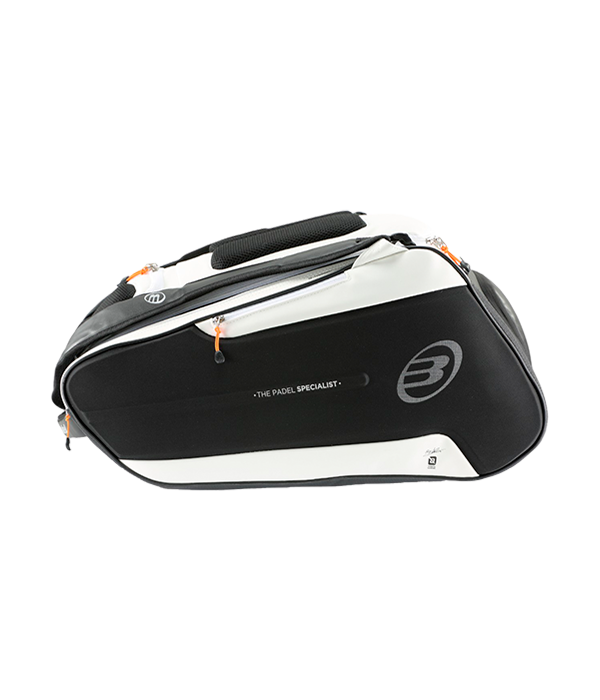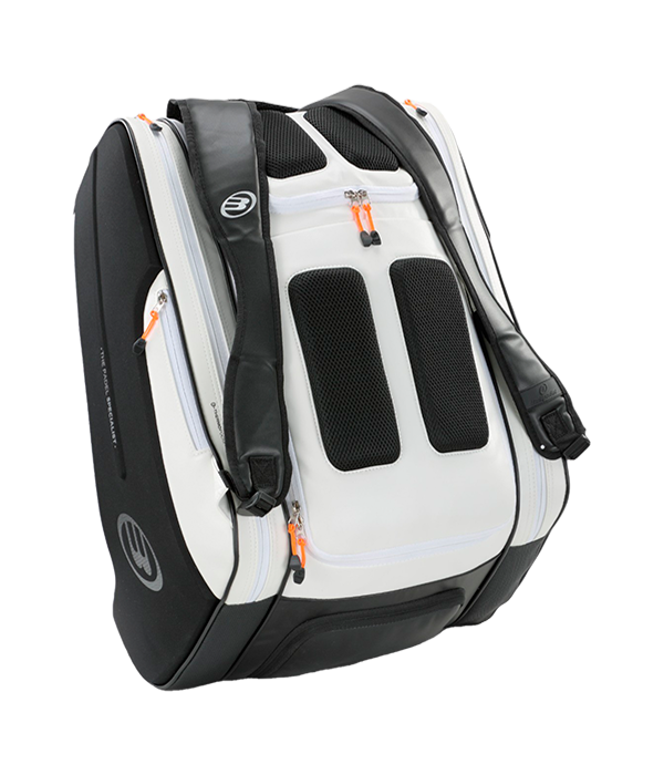 Paletero Bullpadel Hack Blanco, el paletero de Paquito Navarro con un amplio compartimento principal y dos compartimentos adicionales thermo. con espacio para cuatro palas. Además cuenta con un bolsillo separado ventilado para ropa y calzado. Carcasa semirígida que proporciona mayor rigidez y una mayor protección para las palas.