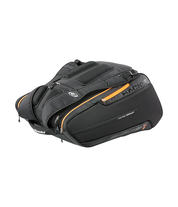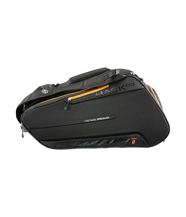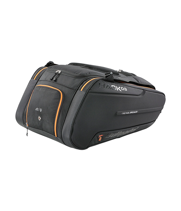 Paletero Bullpadel HACK en color negro Paquito Navarro presenta un compartimento principal para almacenar todos los elementos necesarios y, adicionalmente, cuenta con dos compartimentos térmicos con capacidad para cuatro palas, así como un compartimento independiente y ventilado destinado para la ropa y el calzado.