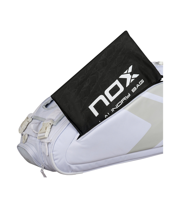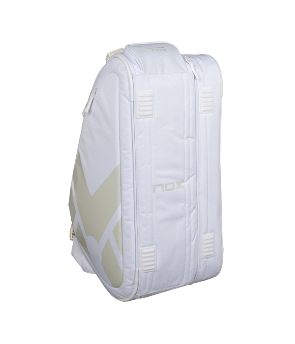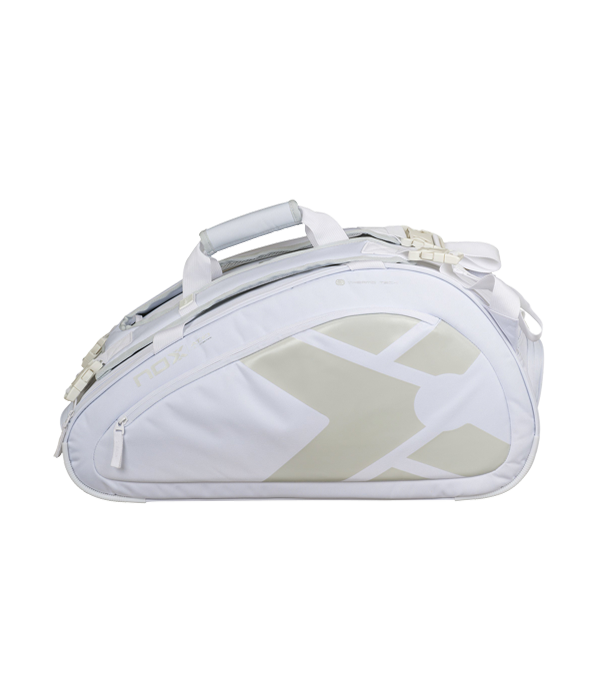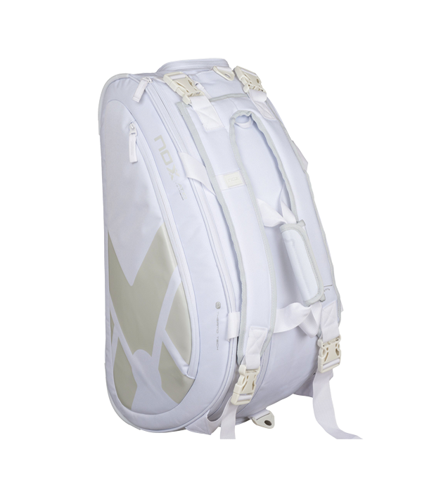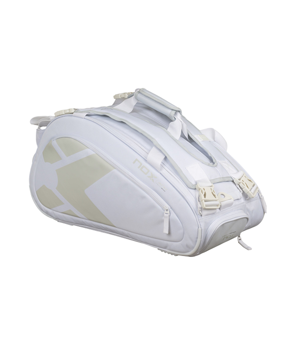 Paletero NOX AT10 Team blanco el modelo diseñado para Agustín Tapia. El compartimento principal de doble cremallera para fácil acceso al interior con capacidad goza de una capacidad para 3 palas de pádel, ropa, etc. Además, cuenta con otro compartimento térmico con capacidad para 2 palas de pádel así como uno más para zapatillas.
